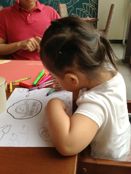 While trying to decide on what to get for food, the friendly waiters came by and gave Allie a placemat that she can color on.